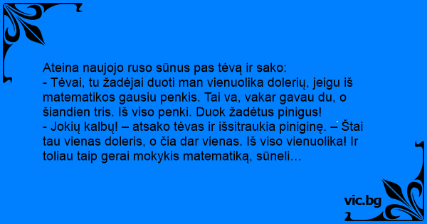 - Jokių kalbų! – atsako tėvas ir išsitraukia piniginę. – Štai tau vienas doleris, o čia dar vienas. Iš viso vienuolika! Ir toliau taip gerai mokykis matematiką, sūneli…