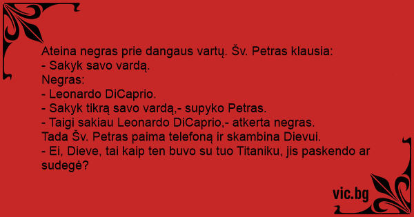 Леонардо Ди Каприо Ο Καρεμπέ Един циганин отива в рая и на вратата го посреща Св. Τιτανικός. Un negro trova la carta d'identità di leonardo di caprio. Due carabinieri fermano una Ferrari guidata da un nero molto distinto per un controllo di routine. L'automobilista accosta e uno dei due carabinieri chiede: “Fornisca patente e libretto d circolazione per cortesia.” Il conducente presenta quanto richiesto e risulta tutto in ordine. Il capo... Due Carabinieri fermano per un normale controllo una Ferrari con un negro molto distinto alla guida. - Documenti per cortesia... Il conducente presenta patente e libretto di circolazione,... San Pedro le pregunta a Barack Obama. - Nombre? - Leonardo Di Caprio, contesta don Barack. San Pedro lo mira incrédulo y le vuelve a preguntar su nombre... - Leonardo Di Caprio, insiste Barack. San... Un hombre negro que llega a las puertas del cielo y le pregunta a San Pedro, ¿Puedo entrar a tu casa? - Tal vez sí, ¿cuál es tu nombre? - Leonardo Di Caprio. - ¡¿Cómo?! - Leonardo Di Caprio.... O cara era negro e o maior ladrão e derrepente foi atropelado por um carro e morreu quando se deu conta estava numa fila na porta do Cêu e São pedro estava fasendo uma triagem para saber quem... Chega no céu um negão, vestido de terno branco, todo engomado, e São Pedro perguntou: — Pois não, quem é você? O negão respondeu: — Leonardo di Caprio. São Pedro olhou bem para ele, consultou a... Un marocchino trova una carta d'identità con il nome Leonardo Di Caprio. Lo ferma un carabiniere è dice: "Carta d'identità" E il marocchino mostra il documento, il carabiniere lo legge e dice a un... Zencinin biri Türkiye'ye gelecekmiş. Gelmek üzere yola çıktığında pasaportunu kaybettiğini anlamış. Üzgün üzgün yürürken yerde bir pasaport bulmuş. Üzerinde leonardo di caprio yazıyormuş.... Un negrito se murio y llego ala entrada del cielo y le prergunta san pedro ¡nombre! Leonardo d´caprio y sampedro confundido ledise Al negrito un momento y seda la vuelta y ¡¡llama a jesus y ledise... Era un negro que estaba formado para la entrar al cielo (el negro había escuchado que San Pedro era racista) y en efecto, lo confirmó cuando vió que San Pedro mandaba a los negros al infierno...... Zemře černoch a dostane se do nebe ke svatému Petrovi. Petr se ho ptá: - ”Jak se jmenuješ?\” Černoch, v obavě že v nebi jsou rasisti, řekne: - ”Leonardo Di Caprio.” Petr se zamyslí a znovu se ho... Un Sénégalais noir comme du charbon, arrive à la douane avec un faux passeport. Tellement faux que la photo sur le passeport est celle de Léonardo Dicaprio. Le douanier observe le passeport pendant... O negao morreu e, estava na fila p/ entrar no ceu. O secretario de Sao Pedro deu um vassilo e o negao viu a lista de chamada, ao notar que seu nome nao estava la., aplicou uma viu o primeiro nome e... No céu Sao Pedro estava atendendo as pessoas mortas que estavam no titanic . Entao um negao aparece e Sao Pedro pergunta :_ Qual é o seu nome? e entao o negao responde:_ Leonardo Dicaprio. Sao... O negao chegou no ceu, e falou pra são pedro. Cade deus e sào pedro disse: esta dormindo, são pedro perguntos. Qual seu nome? ele respondeu: Leonardo di caprio. São pedro desconfio e foi tirar uma... Um negao acaba de morrer e vai para o céu... Chegando la nos portoes,,o cara lhe pergunta: — _Quem e vc? E o negao responde: — _ Sou leonardo de capril. — _tem certeza? — _claro. — _ah,entao vou... Um negão no céu. Aí Sãõ Pedro perguntou: — Qual seu nome? O negão respondeu: — Leonardo de Capriu. Então São Pedro foi perguntar para Deus se o Titanic tinha afundado ou pego fogo Uma vez um negão morreu e foi pro céu chegando lá bateu na porta São Pedro, o atendeu e perguntou: — Quem é? E ele respondeu: — Leonardo di Caprio. São Pedro disse: — Espere um minutinho só! E em... Morreu um negão,mas bem negão mesmo, aí chegando lá no céu, tinha um aviso: Só entrará negão, se for famoso ou se fez um bem na terra. Aí o negão pensou: — Ih, caramba só matei, roubei, fiz mal as... No céu, chega um homem bem moreno e são pedro lhe pergunta: — Quem é você? Ele diz: — Eu sou leonardo di capri então são pedro sai e vai falar com deus: — Vem cá, deus, o titanic afundou ou pegou... Sabe aquele negrão forte do BBB2004, ele morreu e foi para o céu, chegando lá encontrou São Pedro na porta fazendo o controle dos recem chegados, e ai ... São Pedro, perguanta a ele, qual o seu... Um dia desses Bussunda apareceu no céu morto. E São Jorge perguntou: — Qual é o seu nome? E o Bussunda respondeu: — Leonardo de Caprio. São Jorge: — O São Pedro me dá uma ajuda aqui o titanic... Un nero muore e arriva in paradiso. Bussa alle porta quando viene ad aprire San Pietro. San Pietro scruta il nero, emette una smorfia di disgusto e gli chiude la porta in faccia. Il nero rimane li’... Amerika'da zencinin biri pasaportunu kaybetmiş. tamda Turkiye'ye tatile gideceği gün. aksilik bu ya... Ucağı kaçıracak, kara kara düşünürken yolda bir pasaport bulmasın mı ?!.. Hemen almış yerden,... Zencinin biri Amerika'dan Türkiye'ye gelecekmiş. Yola çıktığında pasaportunu kaybettiğini anlamış. Uçağı kaçırma korkusuyla kara kara düşünürken yolda bir pasaport bulmuş. Bir bakmış ki Titanik... Un negru ajunge in Ceruri, cu frica-n san ca nu o sa fie primit in Rai din cauza problemelor rasiste... - Numele? intreaba Sf. Petru. - Leonardo Di Caprio - raspunde negrul. Sfintul Petru il... Prie dangaus vartų ateina negras. - Kas toks būsi? – klausia Šventas Petras. - Leonardo Di Kaprio! Sutrikęs Šventas Petras kažkam skambina: - Alio, šefe, aš kažko čia nesuprantu. „Titanikas“...