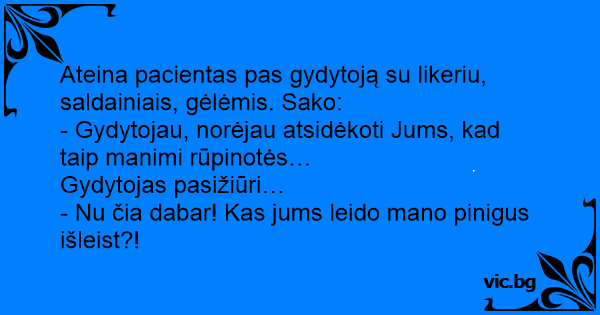 Ateina pacientas pas gydytoją su likeriu, saldainiais, gėlėmis. Sako: