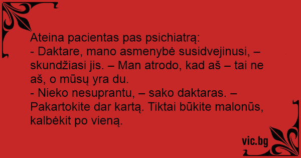 - Daktare, mano asmenybė susidvejinusi, – skundžiasi jis. – Man atrodo, kad aš – tai ne aš, o mūsų yra du.