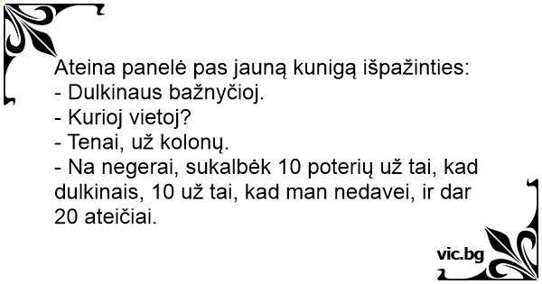 - Na negerai, sukalbėk 10 poterių už tai, kad dulkinais, 10 už tai, kad man nedavei, ir dar 20 ateičiai.