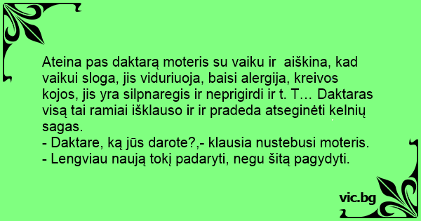 Ateina pas daktarą moteris su vaiku ir aiškina, kad vaikui sloga, jis viduriuoja, baisi alergija, kreivos kojos, jis yra silpnaregis ir neprigirdi ir t. T… Daktaras visą tai ramiai išklauso ir ir pradeda atseginėti kelnių sagas.