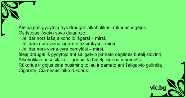 Ateina pas gydytoją trys draugai: alkoholikas, rūkorius ir gėjus.