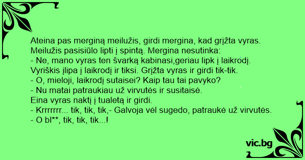- Ne, mano vyras ten švarką kabinasi,geriau lipk į laikrodį. Vyriškis įlipa į laikrodį ir tiksi. Grįžta vyras ir girdi tik-tik.