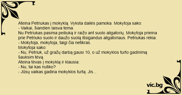 - Nu, Petriuk, už gražų darbą gausi 10, o už mokyklos turto gadinimą šauksim tėvą.