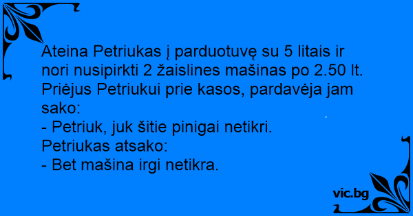 Ateina Petriukas į parduotuvę su 5 litais ir nori nusipirkti 2 žaislines mašinas po 2.50 lt. Priėjus Petriukui prie kasos, pardavėja jam sako: