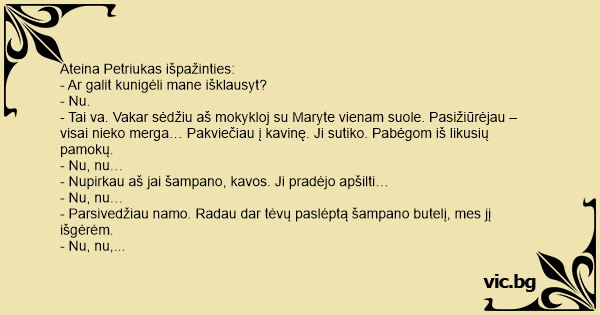 - Tai va. Vakar sėdžiu aš mokykloj su Maryte vienam suole. Pasižiūrėjau – visai nieko merga… Pakviečiau į kavinę. Ji sutiko. Pabėgom iš likusių pamokų.