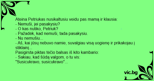 Ateina Petriukas nusikaltusiu veidu pas mamą ir klausia: