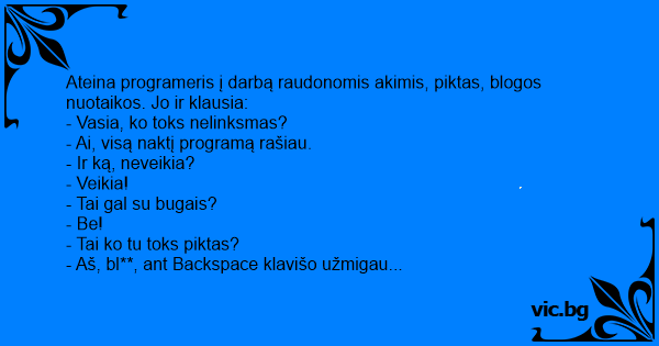 Ateina programeris į darbą raudonomis akimis, piktas, blogos nuotaikos. Jo ir klausia: