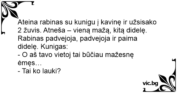 Ateina rabinas su kunigu į kavinę ir užsisako 2 žuvis. Atneša – vieną mažą, kitą didelę. Rabinas padvejoja, padvejoja ir paima didelę. Kunigas: