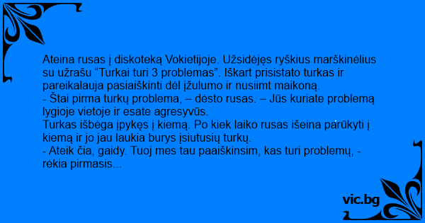 Ateina rusas į diskoteką Vokietijoje. Apsirengęs ryškiais maškinėliais, ant kurių užrašas: „Turkai turi 3 problemas“. Prie ruso išsyk prišoka kažkoks turkas ir pareiškia: - Ė, greitai savo šitą...