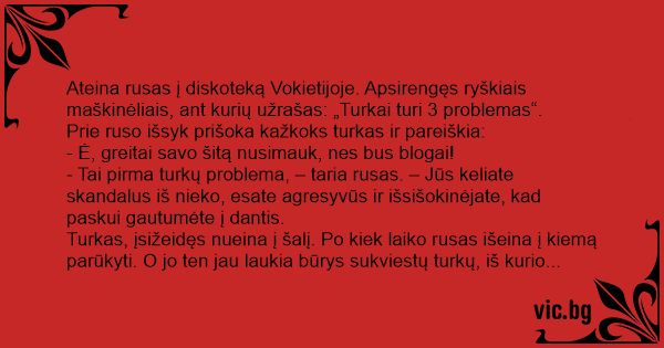Ateina rusas į diskoteką Vokietijoje. Užsidėjęs ryškius marškinėlius su užrašu “Turkai turi 3 problemas”. Iškart prisistato turkas ir pareikalauja pasiaiškinti dėl įžulumo ir nusiimt maikoną. -...