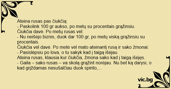 - Gaila – sako rusas – va skolą grąžint norėjau. Nu bet ką darysi, o kad grįždamas nesušalčiau duok spirito, užkast. Išgėrė abu, užkando, pasidulkino, o čiukčia po lova guli ir mąsto: