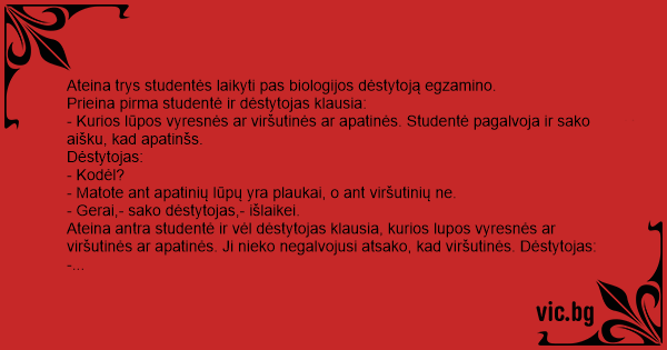 Ateina antra studentė ir vėl dėstytojas klausia, kurios lupos vyresnės ar viršutinės ar apatinės. Ji nieko negalvojusi atsako, kad viršutinės. Dėstytojas: