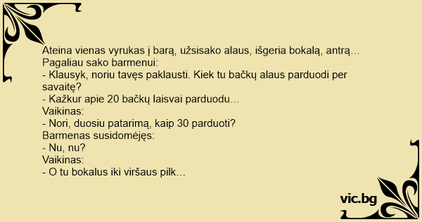 - Klausyk, noriu tavęs paklausti. Kiek tu bačkų alaus parduodi per savaitę?