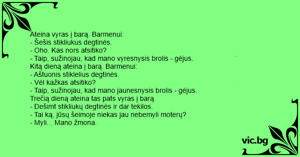 Ateina vyras į barą. Barmenui: