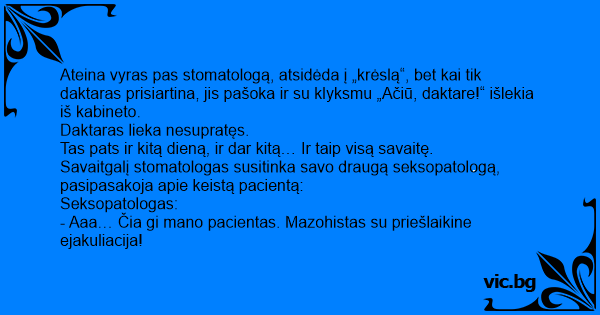 Ateina vyras pas stomatologą, atsidėda į „krėslą“, bet kai tik daktaras prisiartina, jis pašoka ir su klyksmu „Ačiū, daktare!“ išlekia iš kabineto.