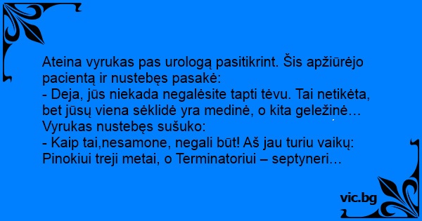 Ateina vyrukas pas urologą pasitikrint. Šis apžiūrėjo pacientą ir nustebęs pasakė: