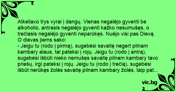 Atkeliavo trys vyrai į dangų. Vienas negalėjo gyventi be alkoholio, antrasis negalėjo gyventi kažko nesumušęs, o trečiasis negalėjo gyventi neparūkęs. Nuėjo visi pas Dievą. O dievas jiems sako: