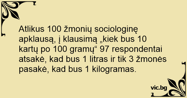Atlikus 100 žmonių sociologinę apklausą, į klausimą „kiek bus 10 kartų po 100 gramų“ 97 respondentai atsakė, kad bus 1 litras ir tik 3 žmonės pasakė, kad bus 1 kilogramas.