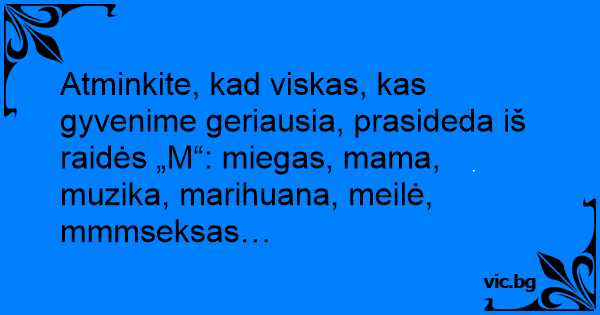 Atminkite, kad viskas, kas gyvenime geriausia, prasideda iš raidės „M“: miegas, mama, muzika, marihuana, meilė, mmmseksas…