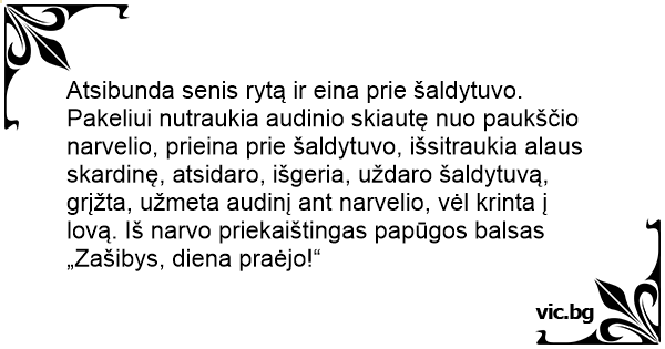 Atsibunda senis rytą ir eina prie šaldytuvo. Pakeliui nutraukia audinio skiautę nuo paukščio narvelio, prieina prie šaldytuvo, išsitraukia alaus skardinę, atsidaro, išgeria, uždaro šaldytuvą, grįžta, užmeta audinį ant narvelio, vėl krinta į lovą. Iš narvo priekaištingas papūgos balsas „Zašibys, diena praėjo!“