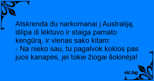 Atskrenda du narkomanai į Australiją, išlipa iš lėktuvo ir staiga pamato kengūrą, ir vienas sako kitam: