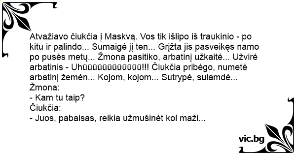Atvažiavo čiukčia į Maskvą. Vos tik išlipo iš traukinio - po kitu ir palindo... Sumaigė jį ten... Grįžta jis pasveikęs namo po pusės metų... Žmona pasitiko, arbatinį užkaitė... Užvirė arbatinis - Uhūūūūūūūūūūūū!!! Čiukčia pribėgo, numetė arbatinį žemėn... Kojom, kojom... Sutrypė, sulamdė... Žmona: