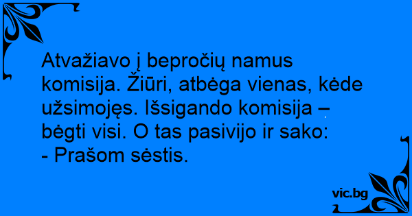 Atvažiavo į bepročių namus komisija. Žiūri, atbėga vienas, kėde užsimojęs. Išsigando komisija – bėgti visi. O tas pasivijo ir sako: