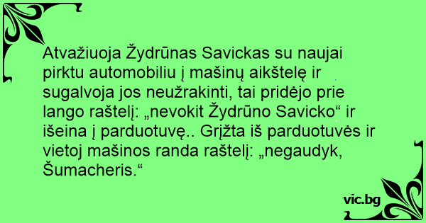 Atvažiuoja Žydrūnas Savickas su naujai pirktu automobiliu į mašinų aikštelę ir sugalvoja jos neužrakinti, tai pridėjo prie lango raštelį: „nevokit Žydrūno Savicko“ ir išeina į parduotuvę.. Grįžta iš parduotuvės ir vietoj mašinos randa raštelį: „negaudyk, Šumacheris.“