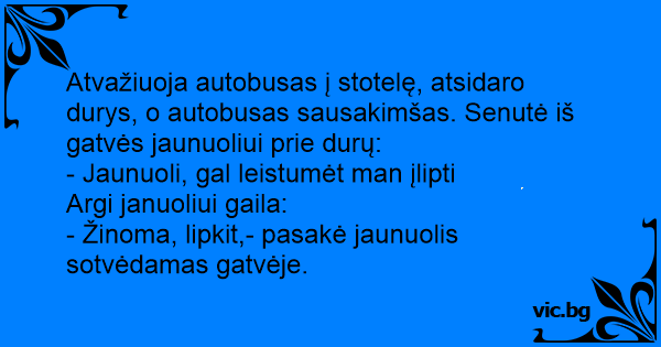 Atvažiuoja autobusas į stotelę, atsidaro durys, o autobusas sausakimšas. Senutė iš gatvės jaunuoliui prie durų: