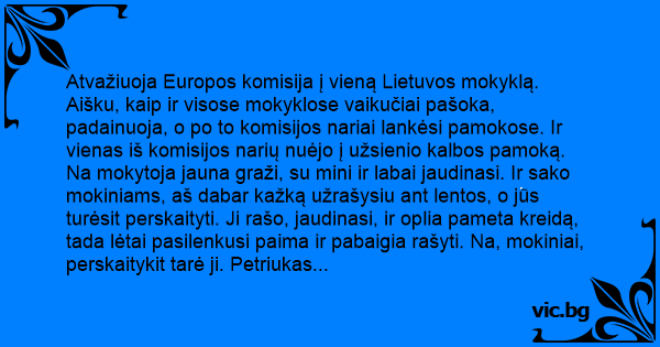 Atvažiuoja Europos komisija į vieną Lietuvos mokyklą. Aišku, kaip ir visose mokyklose vaikučiai pašoka, padainuoja, o po to komisijos nariai lankėsi pamokose. Ir vienas iš komisijos narių nuėjo į užsienio kalbos pamoką. Na mokytoja jauna graži, su mini ir labai jaudinasi. Ir sako mokiniams, aš dabar kažką užrašysiu ant lentos, o jūs turėsit perskaityti. Ji rašo, jaudinasi, ir oplia pameta kreidą, tada lėtai pasilenkusi paima ir pabaigia rašyti. Na, mokiniai, perskaitykit tarė ji. Petriukas pakelia ranka, mokytoja ir džiaugiasi, ir bijo, ji juk jam trejetus rašė už tylėjimą. Na, sakyk Pertiuk, galiausiai tarė mokytoja. Petriukas:
