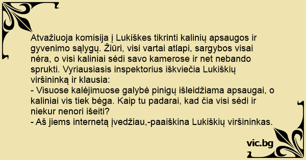 Atvažiuoja komisija į Lukiškes tikrinti kalinių apsaugos ir gyvenimo sąlygų. Žiūri, visi vartai atlapi, sargybos visai nėra, o visi kaliniai sėdi savo kamerose ir net nebando sprukti. Vyriausiasis inspektorius iškviečia Lukiškių viršininką ir klausia:
