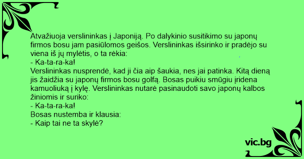 Verslininkas nusprendė, kad ji čia aip šaukia, nes jai patinka. Kitą dieną jis žaidžia su japonų firmos bosu golfą. Bosas puikiu smūgiu įridena kamuoliuką į kylę. Verslininkas nutarė pasinaudoti savo japonų kalbos žiniomis ir suriko: