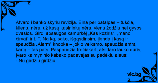 Atvaro į banko skyrių revizija. Eina per patalpas – tuščia, klientų nėra, už kasų kasininkų nėra, vienu žodžiu nei gyvos dvasios. Girdi apsaugos kamurkėj „Kas koziris“, „mano čirvai“ ir t. T. Na ką, sako, išgąsdinsim, įlenda į kasą ir spaudžia „Alarm“ knopke – jokio veiksmo, spaudžia antrą kartą – tas pats. Paspaudžia trečiąkart, atsidaro lauko duris, įvaro kaimyninio kabako padavėjas su padėklu alaus: