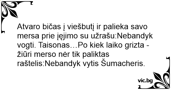 Atvaro bičas į viešbutį ir palieka savo mersa prie įęjimo su užrašu:Nebandyk vogti. Taisonas…Po kiek laiko grizta -žiūri merso nėr tik paliktas raštelis:Nebandyk vytis Šumacheris.