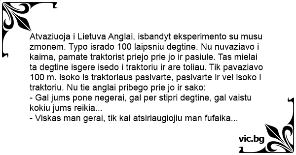 Atvaziuoja i Lietuva Anglai, isbandyt eksperimento su musu zmonem. Typo isrado 100 laipsniu degtine. Nu nuvaziavo i kaima, pamate traktorist priejo prie jo ir pasiule. Tas mielai ta degtine isgere isedo i traktoriu ir are toliau. Tik pavaziavo 100 m. isoko is traktoriaus pasivarte, pasivarte ir vel isoko i traktoriu. Nu tie anglai pribego prie jo ir sako: