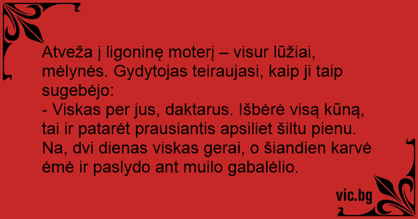 - Viskas per jus, daktarus. Išbėrė visą kūną, tai ir patarėt prausiantis apsiliet šiltu pienu. Na, dvi dienas viskas gerai, o šiandien karvė ėmė ir paslydo ant muilo gabalėlio.