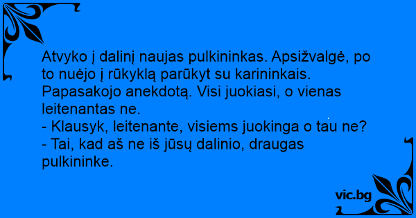 Atvyko į dalinį naujas pulkininkas. Apsižvalgė, po to nuėjo į rūkyklą parūkyt su karininkais. Papasakojo anekdotą. Visi juokiasi, o vienas leitenantas ne.