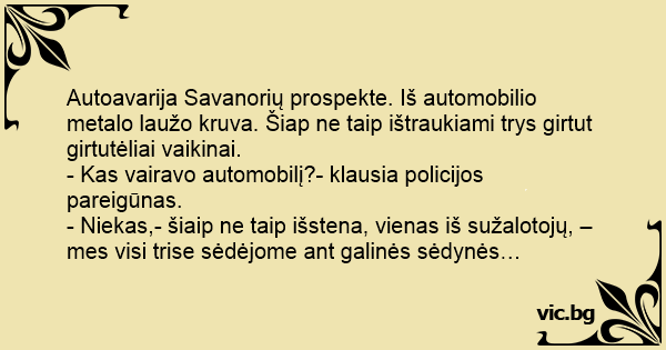 - Niekas,- šiaip ne taip išstena, vienas iš sužalotojų, – mes visi trise sėdėjome ant galinės sėdynės…