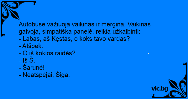 Autobuse važiuoja vaikinas ir mergina. Vaikinas galvoja, simpatiška panelė, reikia užkalbinti: