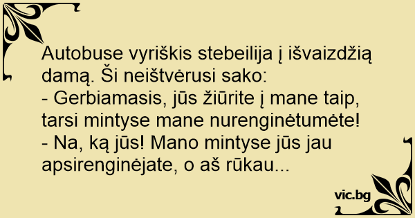 Autobuse vyriškis stebeilija į išvaizdžią damą. Ši neištvėrusi sako: