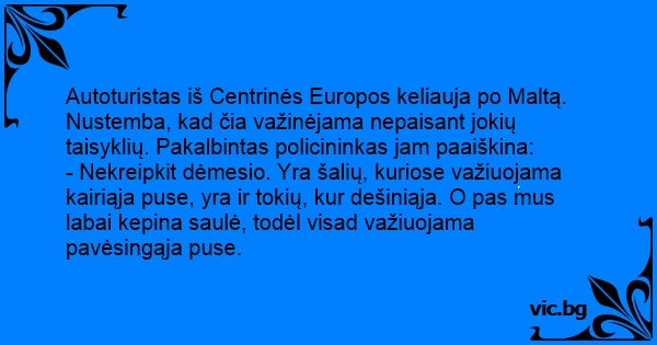 - Nekreipkit dėmesio. Yra šalių, kuriose važiuojama kairiąja puse, yra ir tokių, kur dešiniąja. O pas mus labai kepina saulė, todėl visad važiuojama pavėsingąja puse.