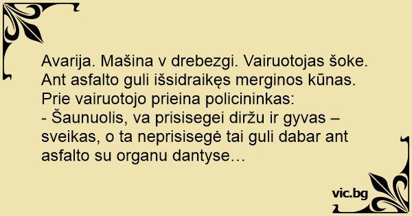 - Šaunuolis, va prisisegei diržu ir gyvas – sveikas, o ta neprisisegė tai guli dabar ant asfalto su organu dantyse…