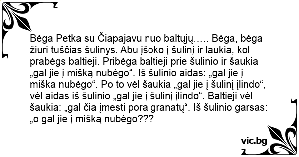 Bėga Petka su Čiapajavu nuo baltųjų….. Bėga, bėga žiūri tuščias šulinys. Abu įšoko į šulinį ir laukia, kol prabėgs baltieji. Pribėga baltieji prie šulinio ir šaukia „gal jie į mišką nubėgo“. Iš šulinio aidas: „gal jie į miška nubėgo“. Po to vėl šaukia „gal jie į šulinį įlindo“, vėl aidas iš šulinio „gal jie į šulinį įlindo“. Baltieji vėl šaukia: „gal čia įmesti pora granatų“. Iš šulinio garsas: „o gal jie į mišką nubėgo???