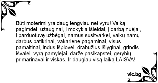 Būti moterimi yra daug lengviau nei vyru! Vaiką pagimdei, užauginai, į mokyklą išleidai, į darbą nuėjai, į parduotuvę užbėgai, namus susitvarkei, vaikų namų darbus patikrinai, vakarienę pagaminai, visus pamaitinai, indus išplovei, drabužius išlyginai, grindis išvalei, vyrą pamylėjai, darže pasikapstei, gėrybių primarinavai ir viskas. Ir daugiau visą laiką LAISVA!