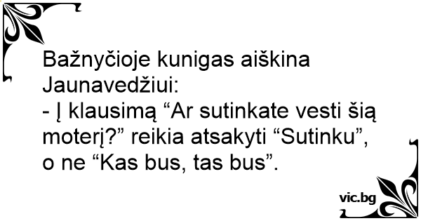 - Į klausimą “Ar sutinkate vesti šią moterį?” reikia atsakyti “Sutinku”, o ne “Kas bus, tas bus”.