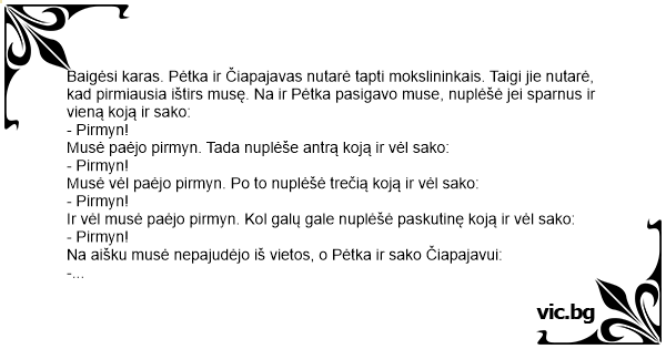 Baigėsi karas. Pėtka ir Čiapajavas nutarė tapti mokslininkais. Taigi jie nutarė, kad pirmiausia ištirs musę. Na ir Pėtka pasigavo muse, nuplėšė jei sparnus ir vieną koją ir sako: