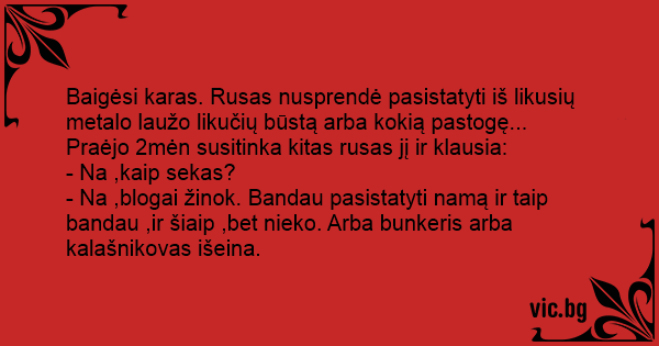 - Na ,blogai žinok. Bandau pasistatyti namą ir taip bandau ,ir šiaip ,bet nieko. Arba bunkeris arba kalašnikovas išeina.