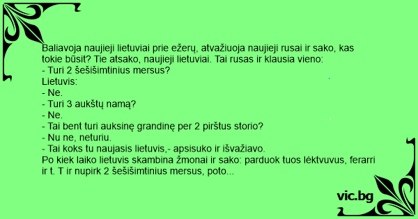 Baliavoja naujieji lietuviai prie ežerų, atvažiuoja naujieji rusai ir sako, kas tokie būsit? Tie atsako, naujieji lietuviai. Tai rusas ir klausia vieno: